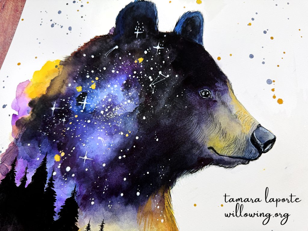Create an ethereal painting of a bear infused with a galaxy’s sparkling light!