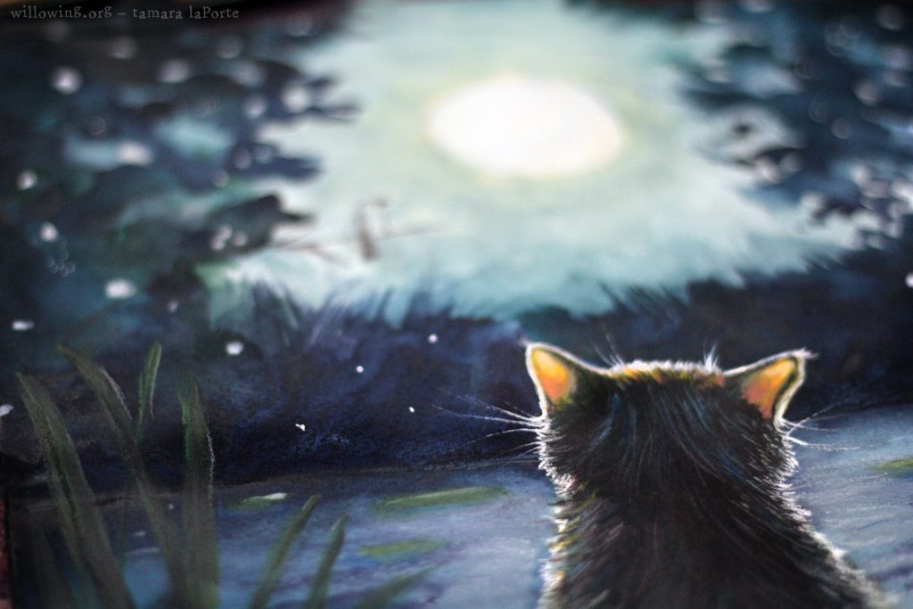 Create a serene scene of a sweet kitten sitting peacefully by a still pond!