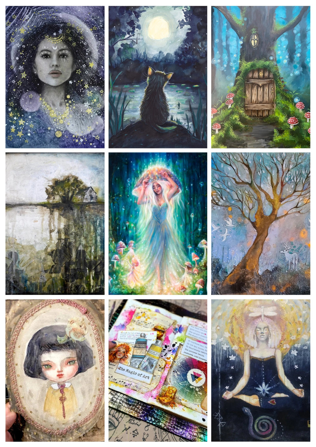 - Exploring the Magic of Technique – Unravel magic within the creative process itself; play with supplies and creative tricks; like collage, gold leaf, dreamy colours, and textures; to spark discovery and wonder in your art.