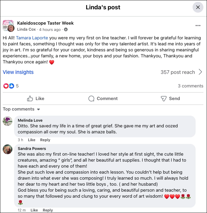 Unbelievable, Life changing, jammed packed classes for any skill level. Wonderful teachers that explain and guide you to create in a loving environment. They even have a Facebook group just for you and your class mates to share and support one another. You will not be sorry, Tam is amazing and will have you relaxed and comfortable and all the teachers are as well. There is something in Life Book that is waiting for just you. – Denise Sorro-Butler – Tennessee, USA
