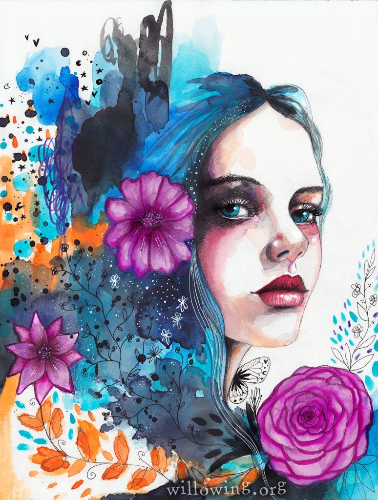 In this lesson, we are going to create an angled (or ¾ portrait) of a female surrounded by botanical and abstract elements which will represent the things, people, items, experiences, animals etc in your life that you are grateful for. We will paint a high contrast portrait paint mostly watercolour paint.