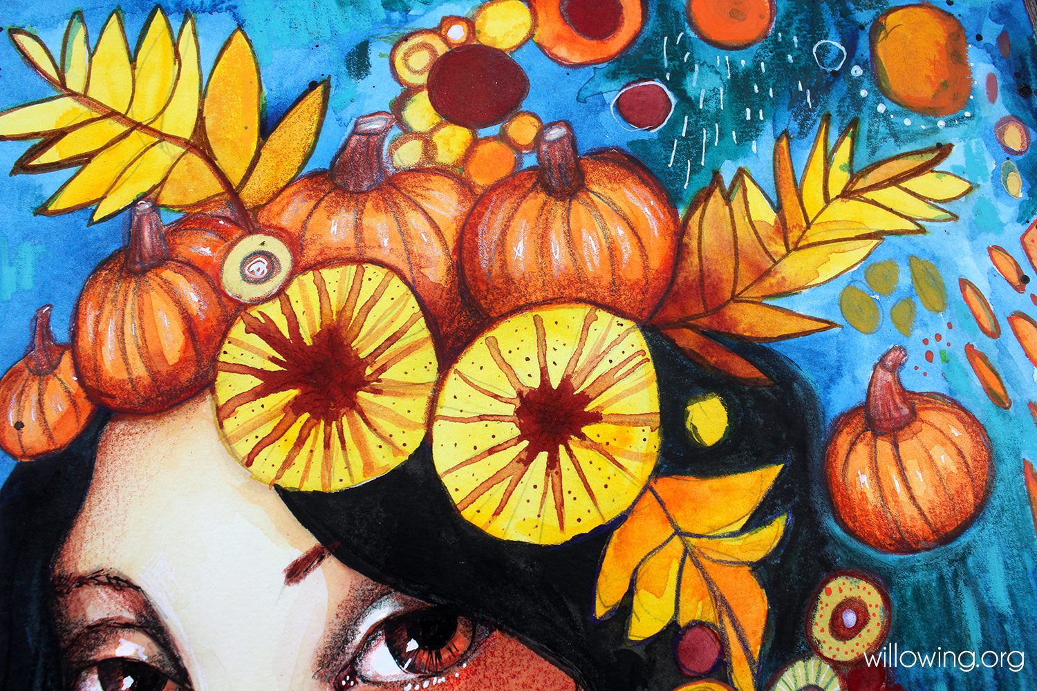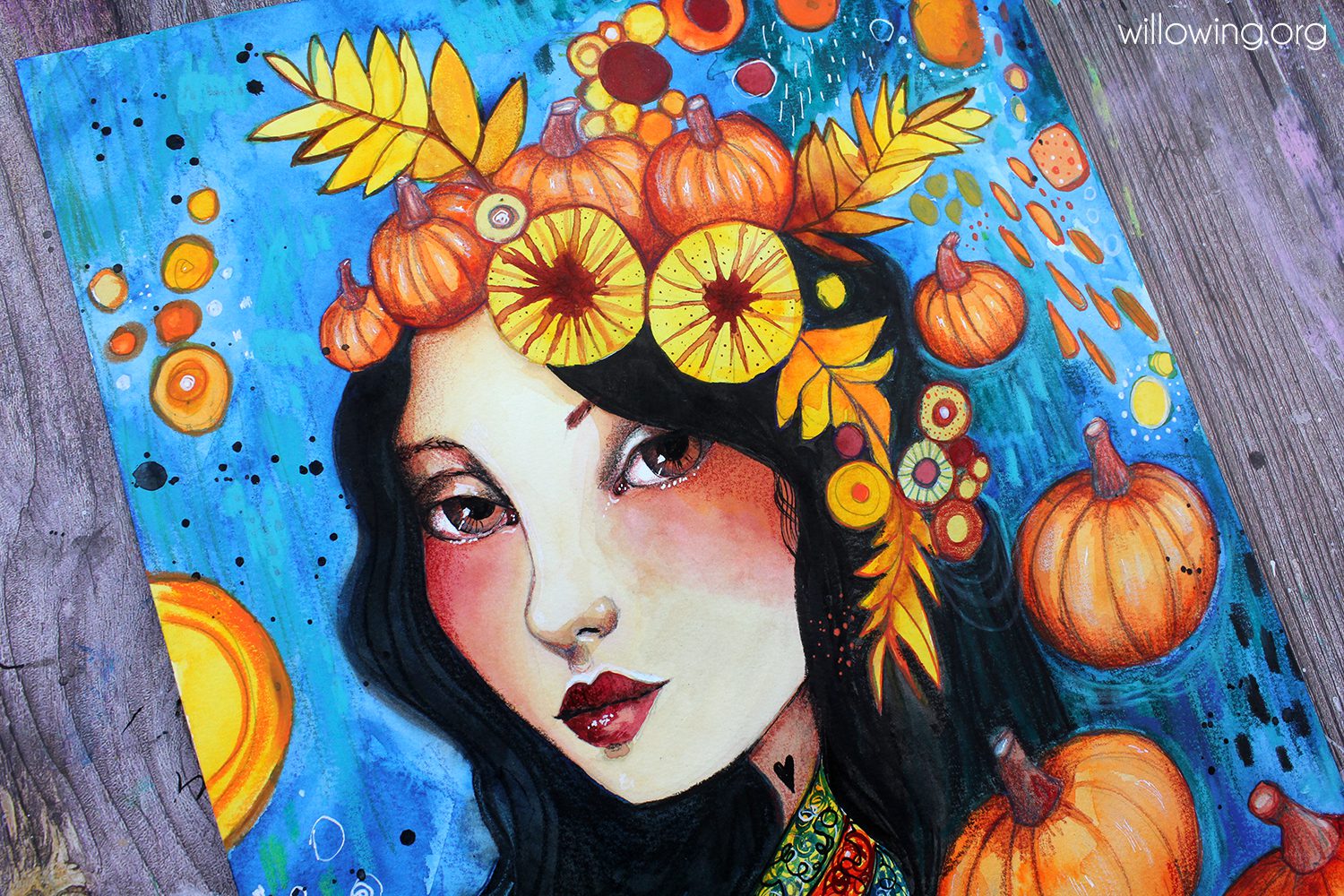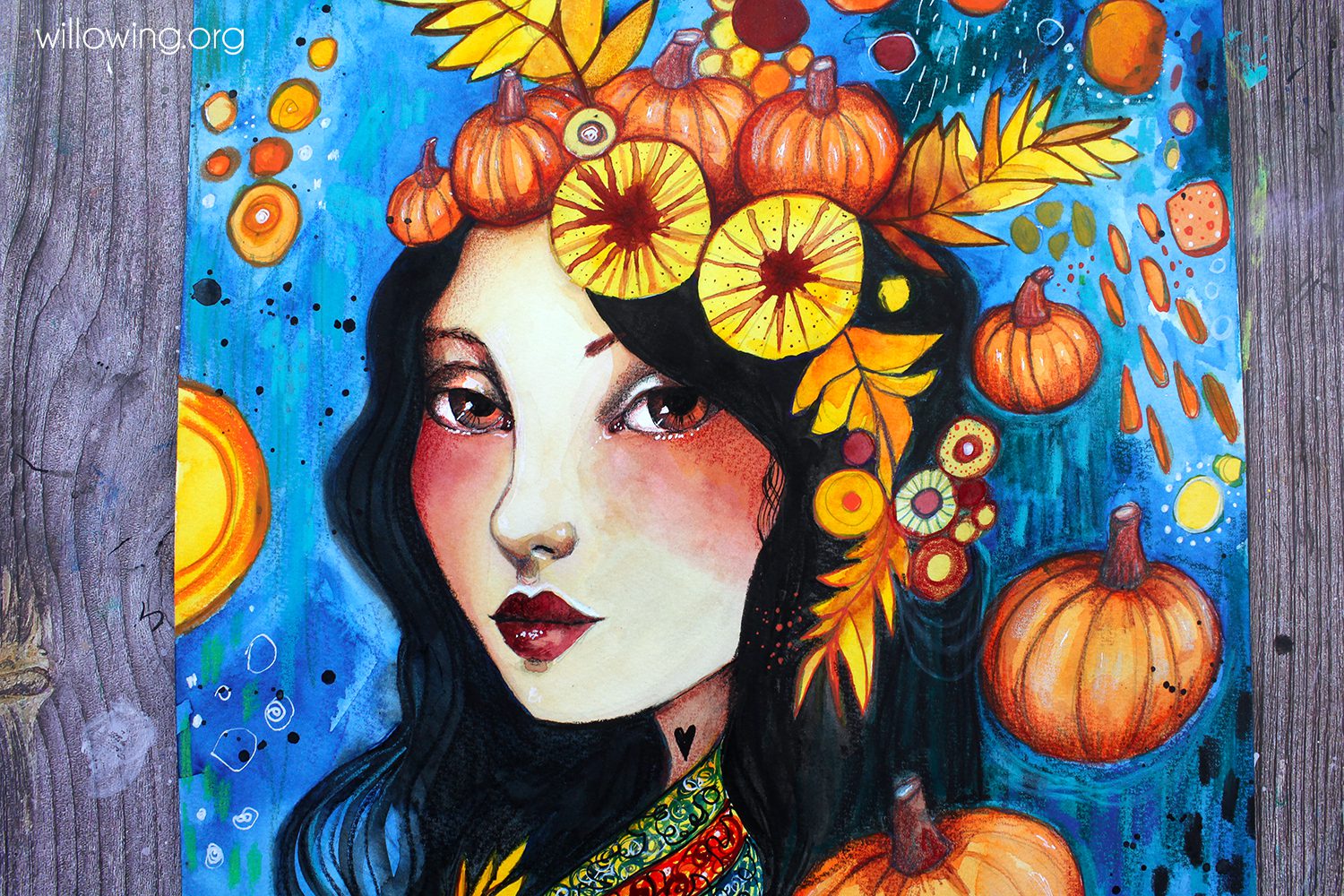 Paint the inspiring Goddess Autumnus, surrounded by imagery of the bountiful harvest. Channel some of the decorative and detailed style of Gustav Klimt in this lesson.
