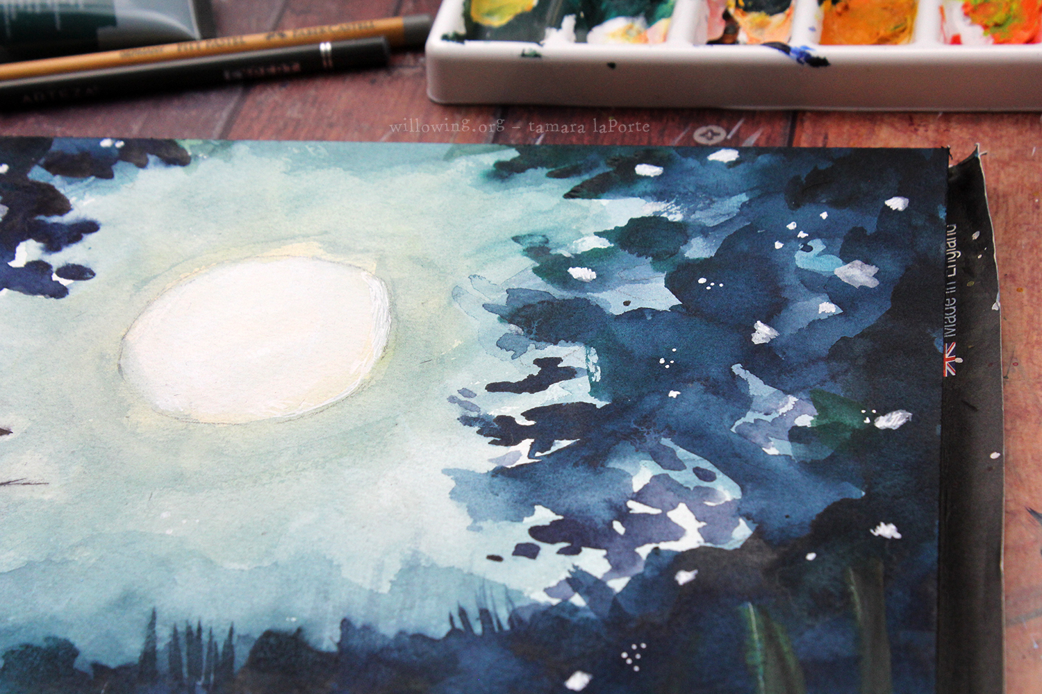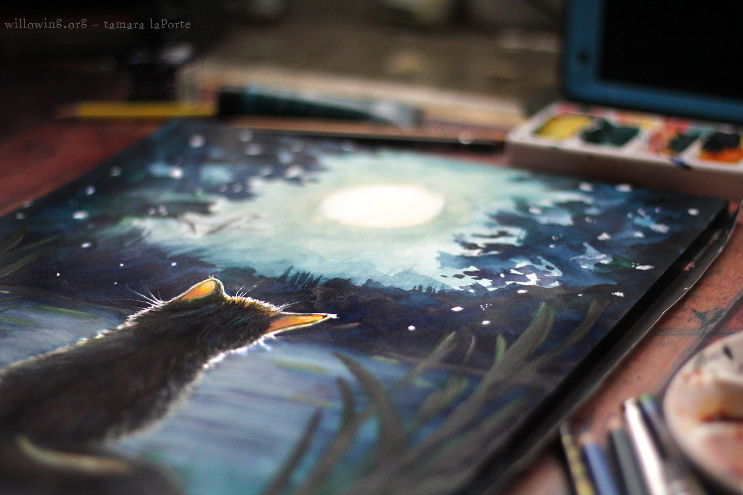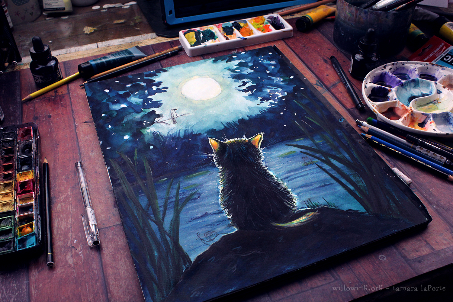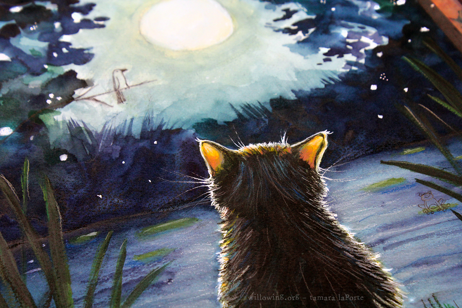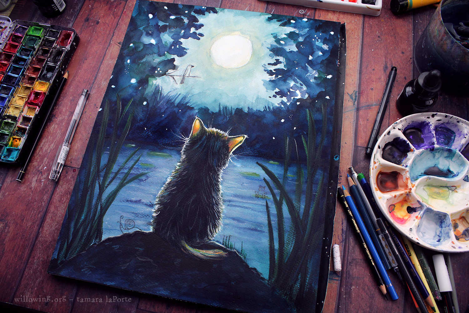 In this lesson, we will create a serene scene of a sweet kitten sitting peacefully by a still pond, gazing up at the glowing full moon as it casts its radiant light across the water. The moonlight serves as a metaphor for clarity and insight, illuminating the darkness and reflecting moments of understanding and awareness. Technically we’ll look at how to paint a backlit figure that also has ‘rim lighting’ which often happens when a subject is lit up from behind.
