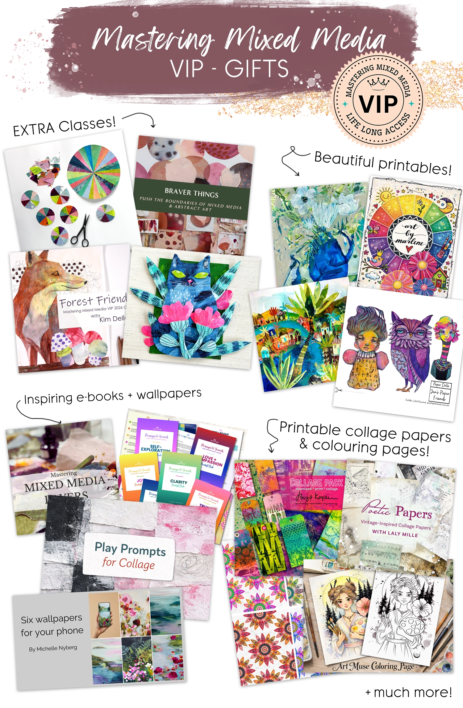 - 🎨 35+ Exclusive Mixed Media Lessons – Dive into a variety of techniques, styles, and creative approaches.