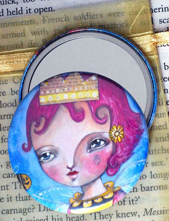 They measure 2.25″ (5.5cm) and have a reproduction of my artwork on them. They have a beautiful glossy finish and come with a real glass mirror on the back! ♥