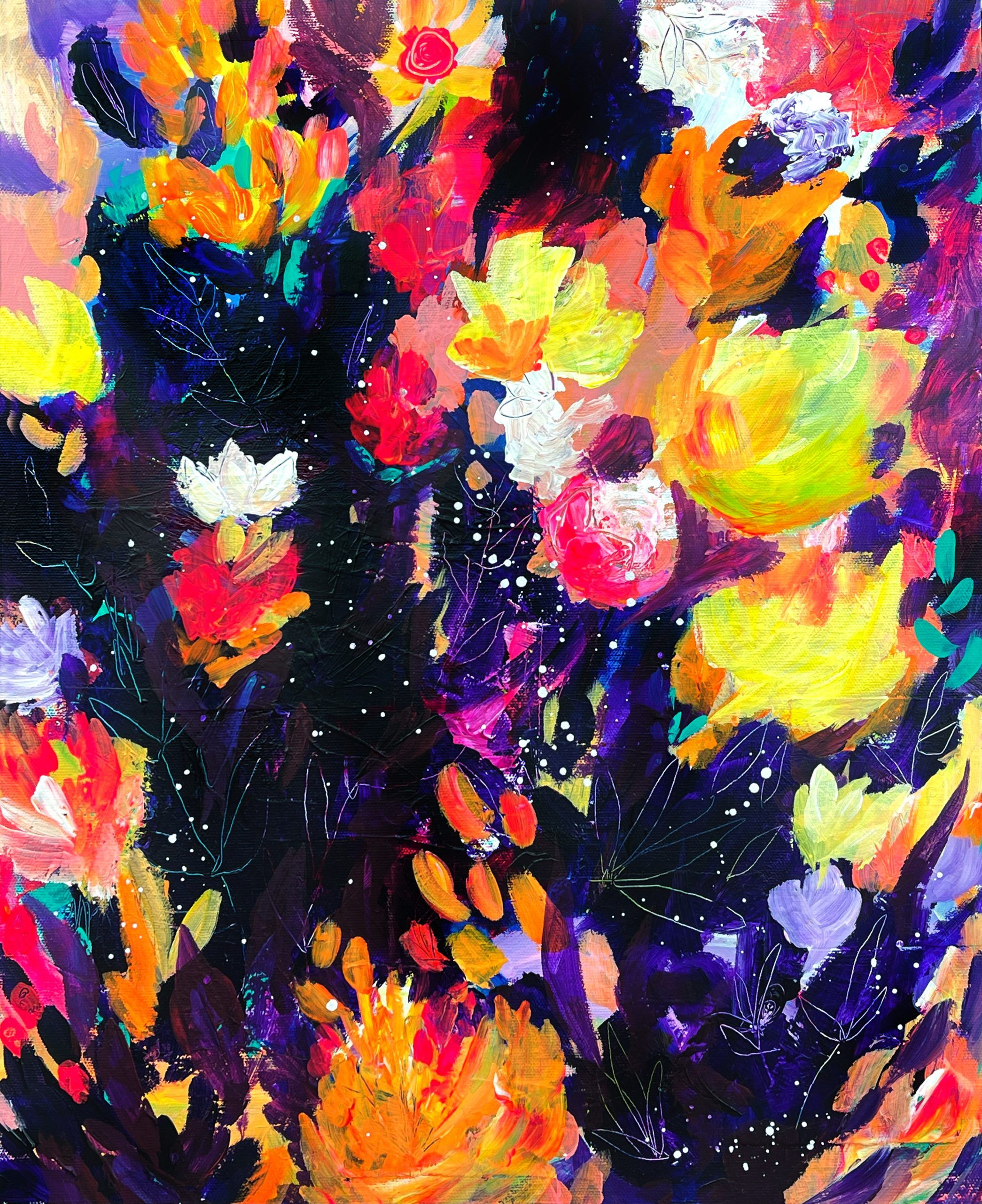 This painting was inspired by the mystery of the night and the wonders that lie within it. This painting features dynamic brush strokes, expressive colours and beautiful marks and textures.