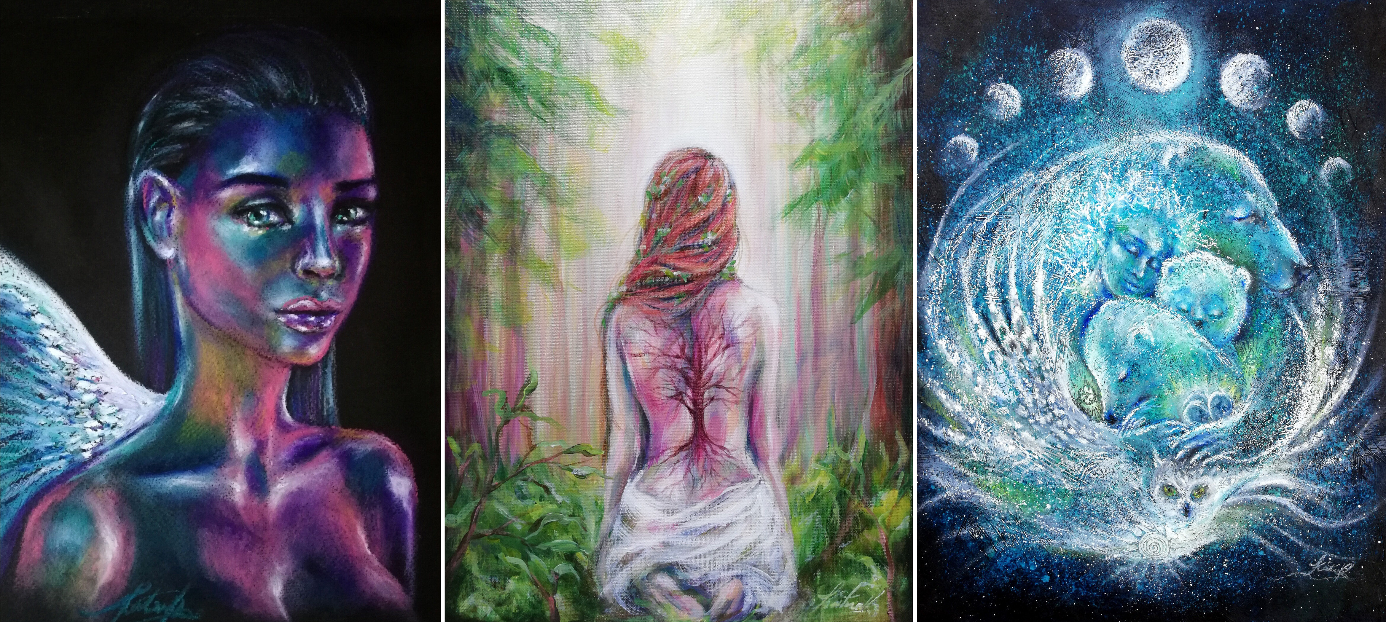 I am an artist, mom, nature-lover and online teacher. I love to create from my visions, dreams, and be inspired by nature. When I’m not busy creating or teaching I am taking care of my two boys. They both share my love for nature and art, and I always take them with me on my hikes. My 7 yr old often joins me at my art table, while my baby often sits on my lap as I paint…He likes to dip his hands in the paint, lol!