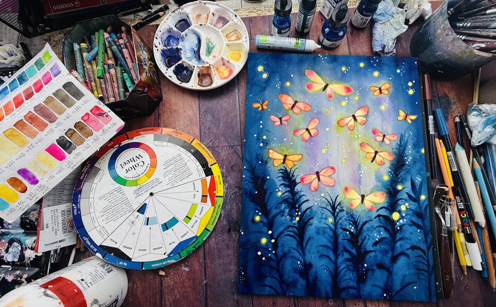 This year I am leading a session in which we will reflect on our year, finding our ‘sparks of light’ and painting these are bright little fireflies in a night sky. 😊 I had a lot of fun painting this, you can too! Please come and join us here.